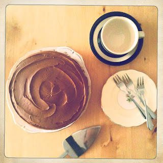 It's a simple strategy really, whenever I make chocolate cake (Nigella's all in one recipe in Feast is my go to), I make a double batch, that is four sandwich layers rather than two and bung two of them in the freezer *in case of emergency*. It works for me as my local Sainsburys only sells sour cream by the 300ml tub and the basic recipe requires half that amount. It is sensible then to use it all up, no? Besides I am a double, triple, quadruple batch type of a cook. It's practical and means I can justify using huge pots and long handled wooden spoons. Any excuse for that in my kitchen makes me a happy haggis.